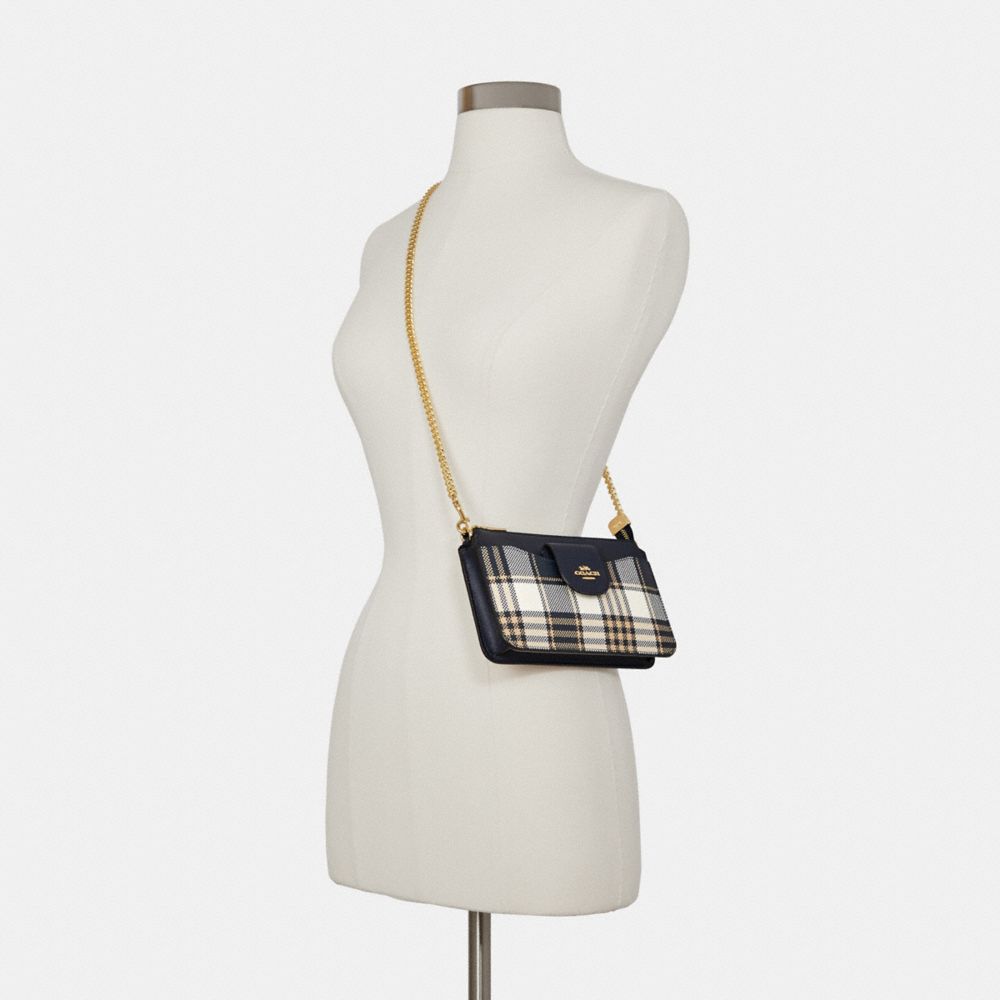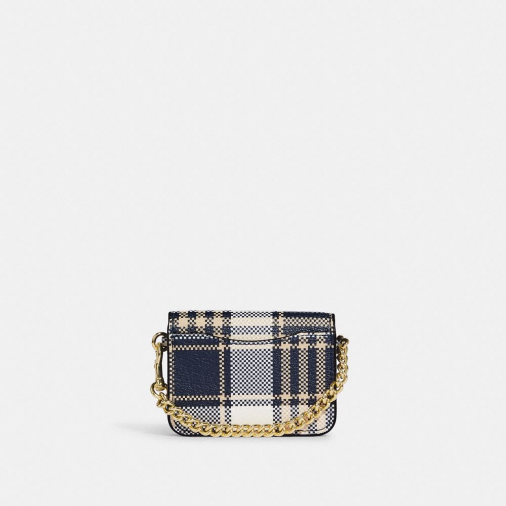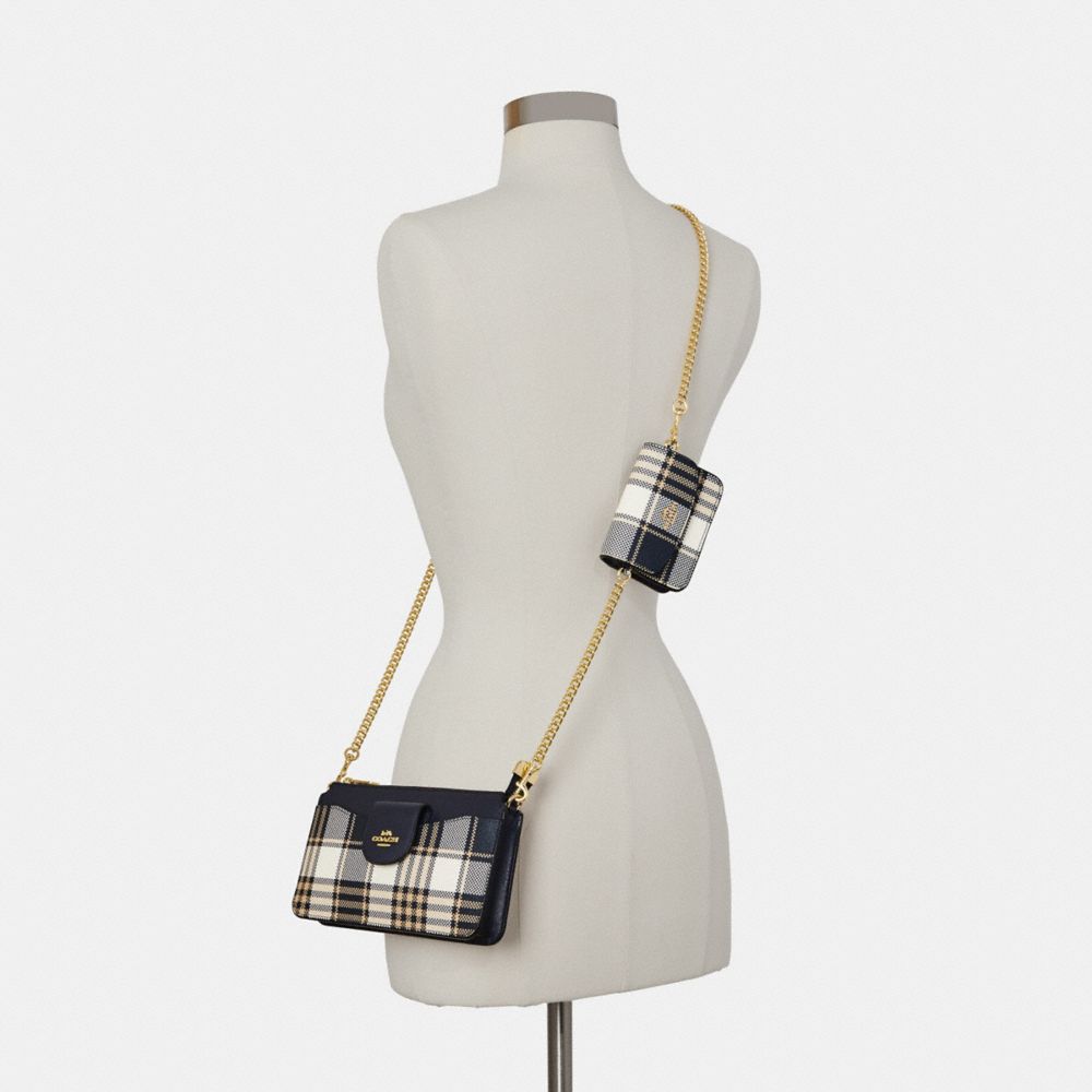 Printed coated canvas and smooth leather| Crossbody pouch:| Two credit card slots| Zip-top closure, fabric lining| Outside snap pocket| Chain strap with 22" drop for shoulder or crossbody wear (17" drop with card case detached)| 8 1/4" (L) x 4 3/4" (H) x 1 1/4" (W)| Detachable card case:| Inside multifunction pocket| Snap closure, fabric lining| Outside open pocket| Chain strap with 3" drop| 4" (L) x 3" (H) x 1" (W)Style No. C8682