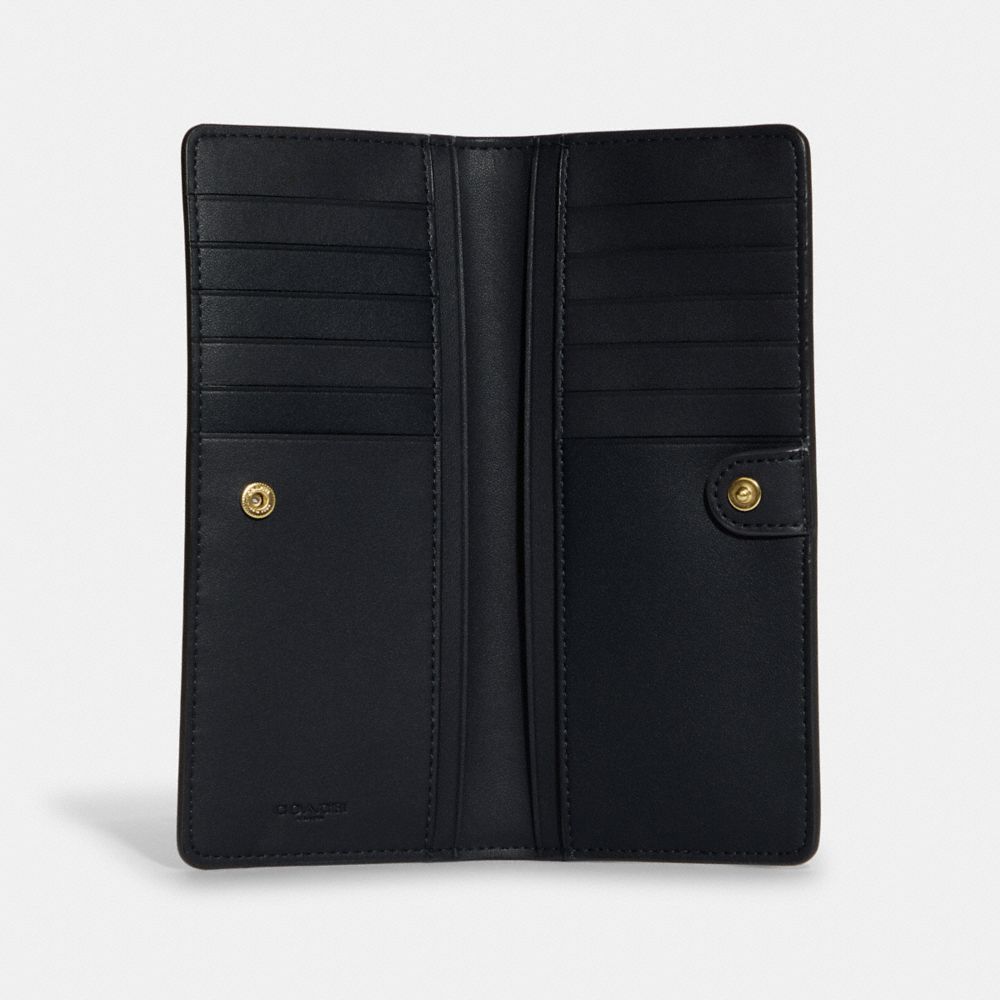 Printed coated canvas and smooth leather| 12 credit card slots| Full-length bill compartments| Snap closure| Outside zip pocket| 7 1/2" (L) x 3 1/2" (H) x 1/2 (W)Style No. C8686