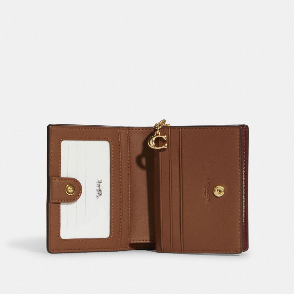 Signature coated canvas and smooth leather| Three credit card slots| ID window| Full-length bill compartment| Snap closure| Outside zip coin pocket| 4 1/4" (L) x 3 1/2" (H) x 1" (W)Style No. C8734
