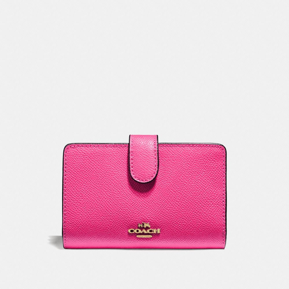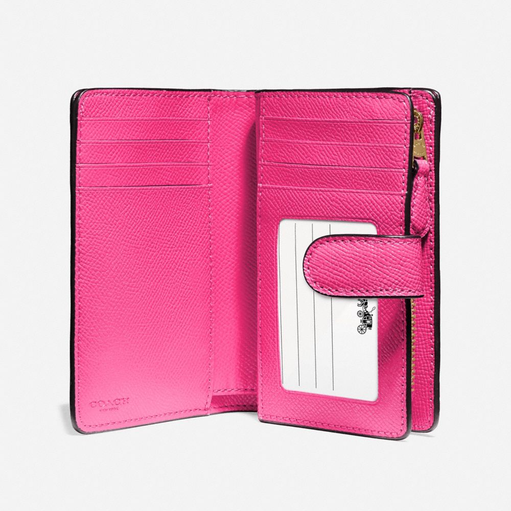 Crossgrain leather| Seven credit card slots| Bill compartment| ID window| Zip pocket| Snap closure| 5" (L) x 3 1/2" (H) x 1/2" (W)