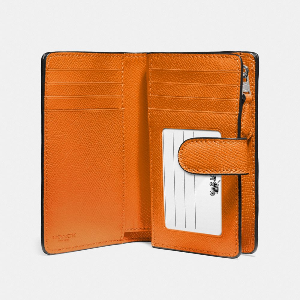 Crossgrain leather| Seven credit card slots| Bill compartment| ID window| Zip pocket| Snap closure| 5" (L) x 3 1/2" (H) x 1/2" (W)