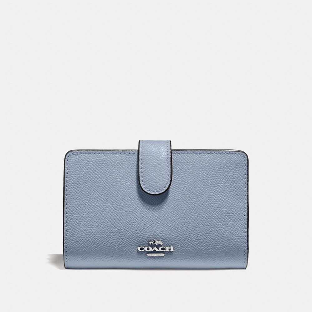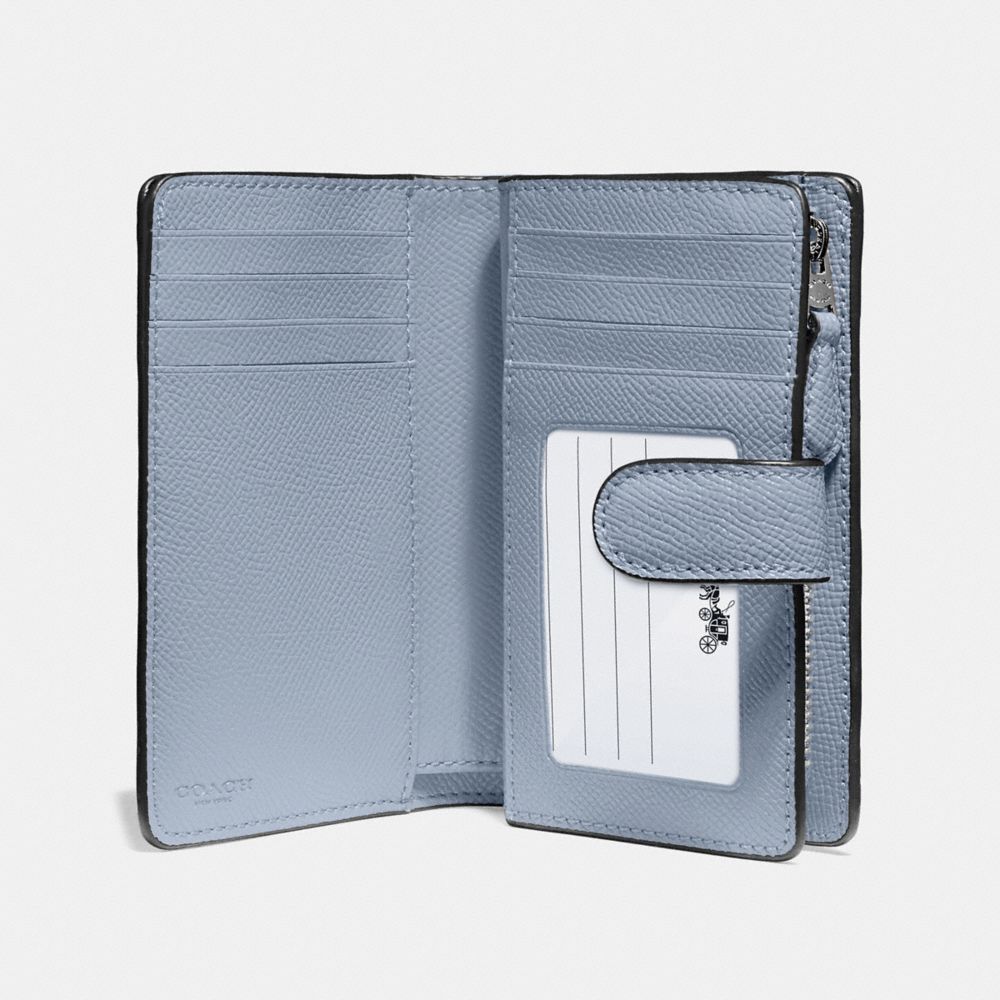 Crossgrain leather| Seven credit card slots| Bill compartment| ID window| Zip pocket| Snap closure| 5" (L) x 3 1/2" (H) x 1/2" (W)