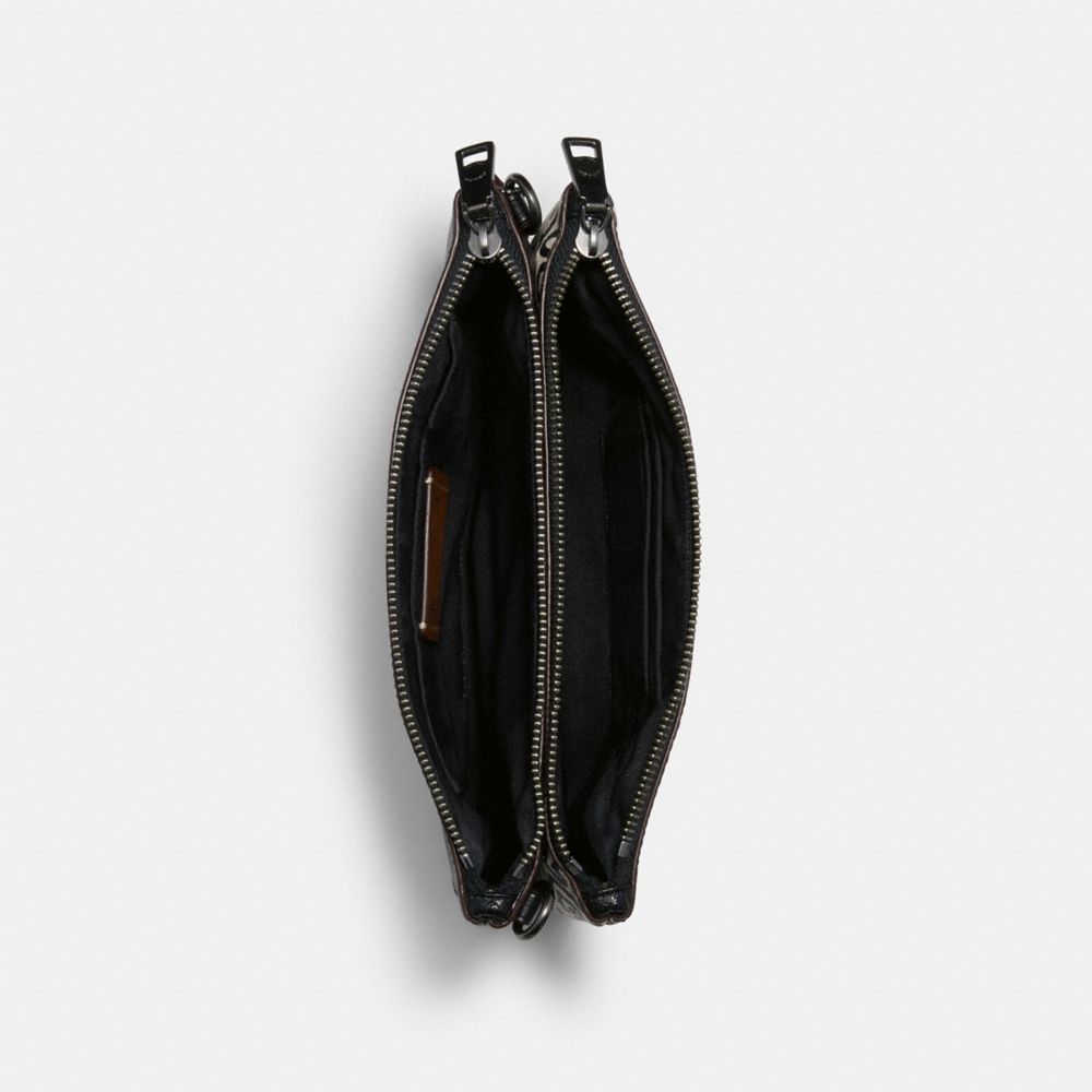 Printed coated canvas| Two credit card slots| Inside multifunction pocket| Double zip closure, fabric lining| Center slip compartment| Detachable strap with 22 3/4" drop for shoulder or crossbody wear| 9 1/2" (L) x 6" (H) x 2 1/4" (W)