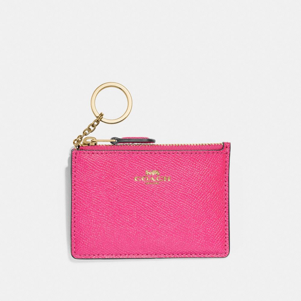 Crossgrain leather| Credit card slot and ID window| Zip-top closure, fabric lining| Attached split key ring| 4 1/4" (L) x 3" (H) x 1/2" (W)