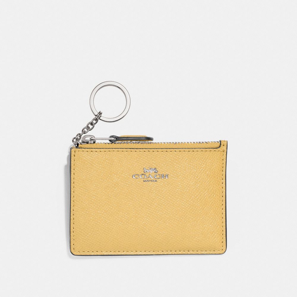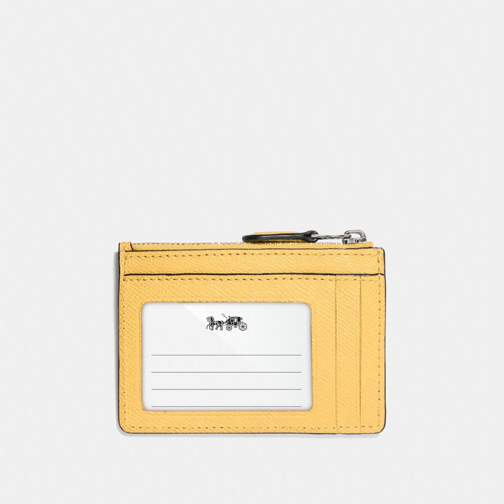 Crossgrain leather| Credit card slot and ID window| Zip-top closure, fabric lining| Attached split key ring| 4 1/4" (L) x 3" (H) x 1/2" (W)