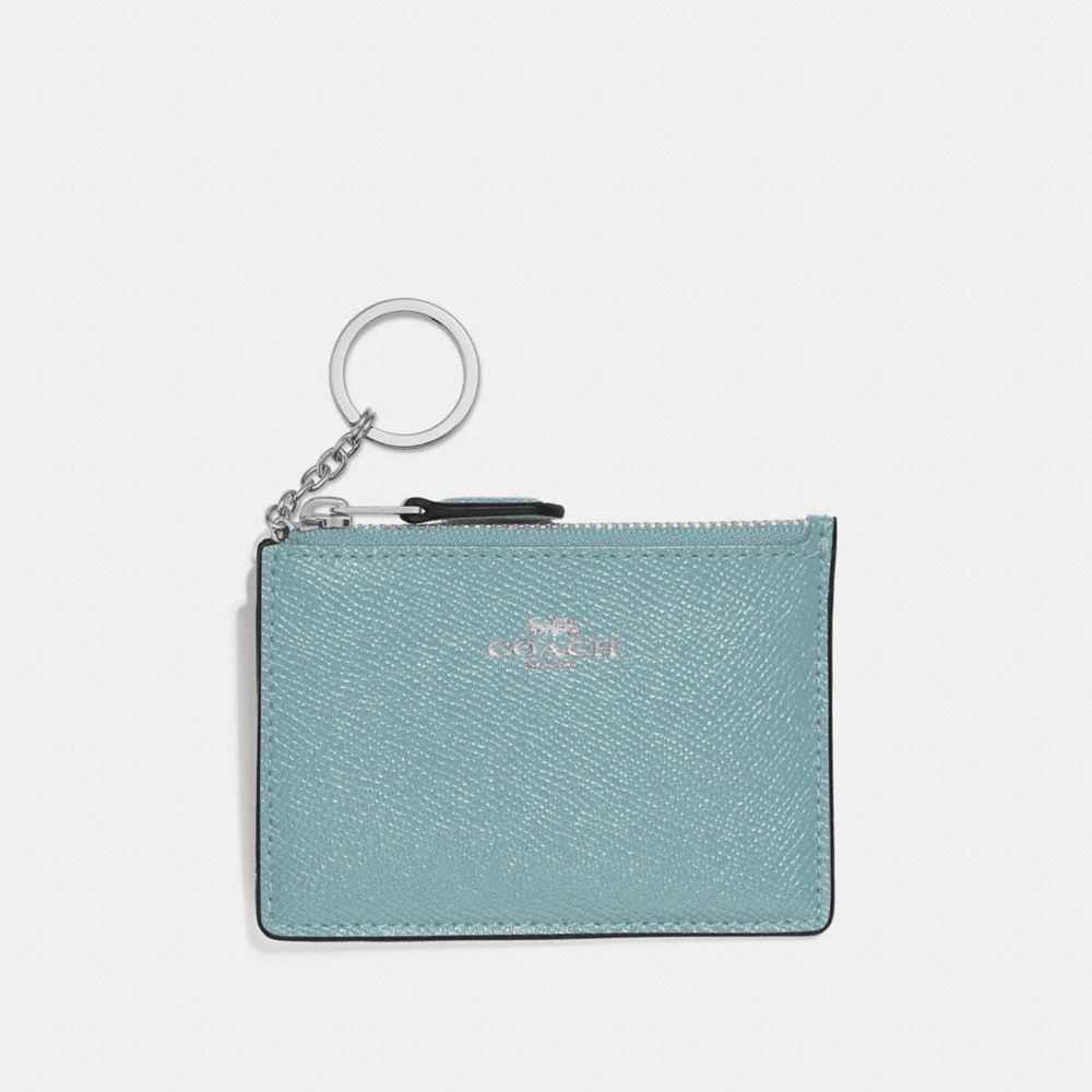 Crossgrain leather| Credit card slot and ID window| Zip-top closure, fabric lining| Attached split key ring| 4 1/4" (L) x 3" (H) x 1/2" (W)