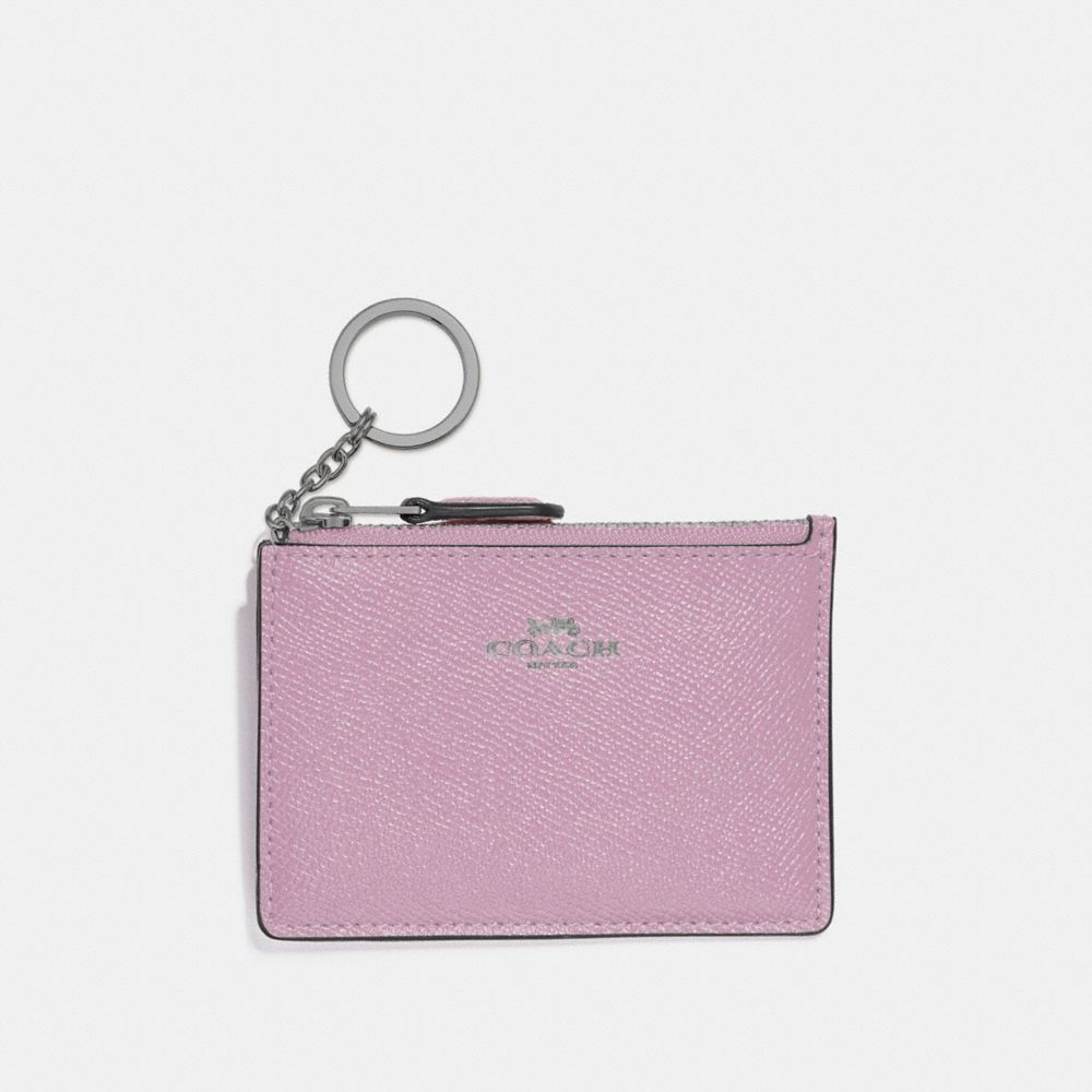 Crossgrain leather| Credit card slot and ID window| Zip-top closure, fabric lining| Attached split key ring| 4 1/4" (L) x 3" (H) x 1/2" (W)