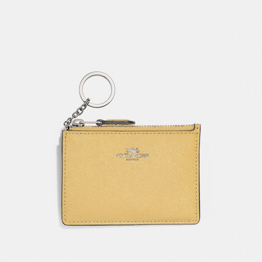 | Crossgrain leather| Credit card slot and ID window| Zip-top closure, fabric lining| Attached split key ring| 4 1/4" (L) x 3" (H) x 1/2" (W)