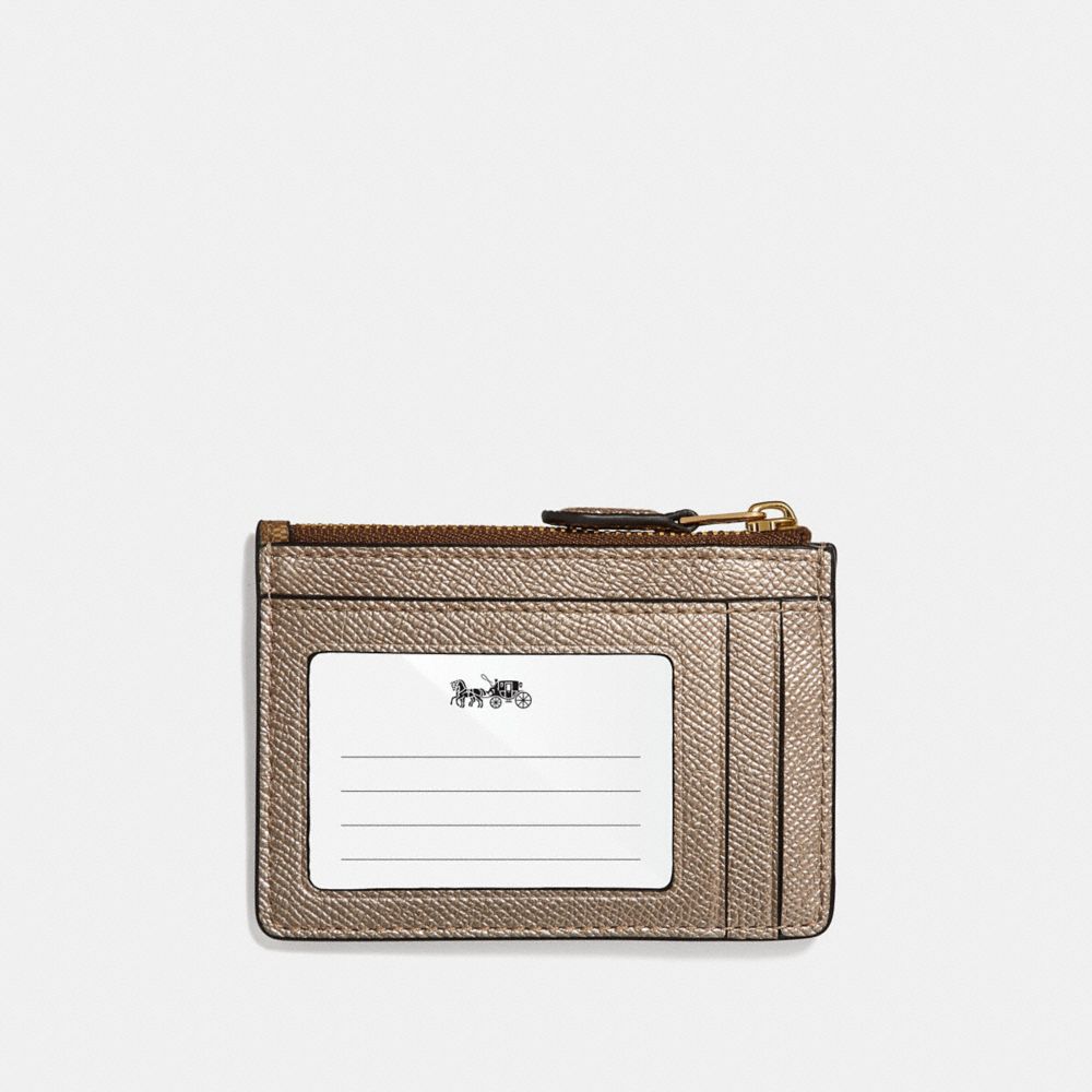 Signature coated canvas| Credit card slot and ID window| Zip-top closure, fabric lining| Attached split key ring| 4 1/4" (L) x 3" (H) x 1/2" (W)