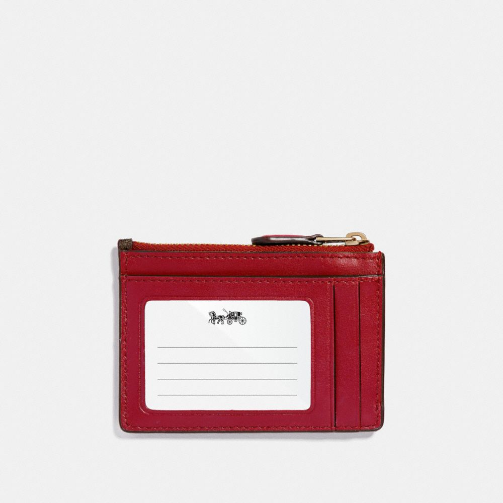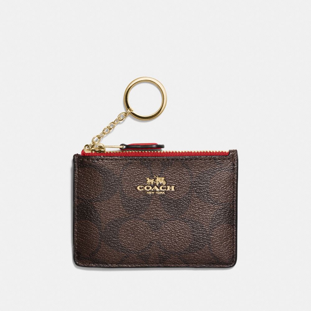 | Signature coated canvas| Credit card slot and ID window| Zip-top closure, fabric lining| Attached split key ring| 4 1/4" (L) x 3" (H) x 1/2" (W)