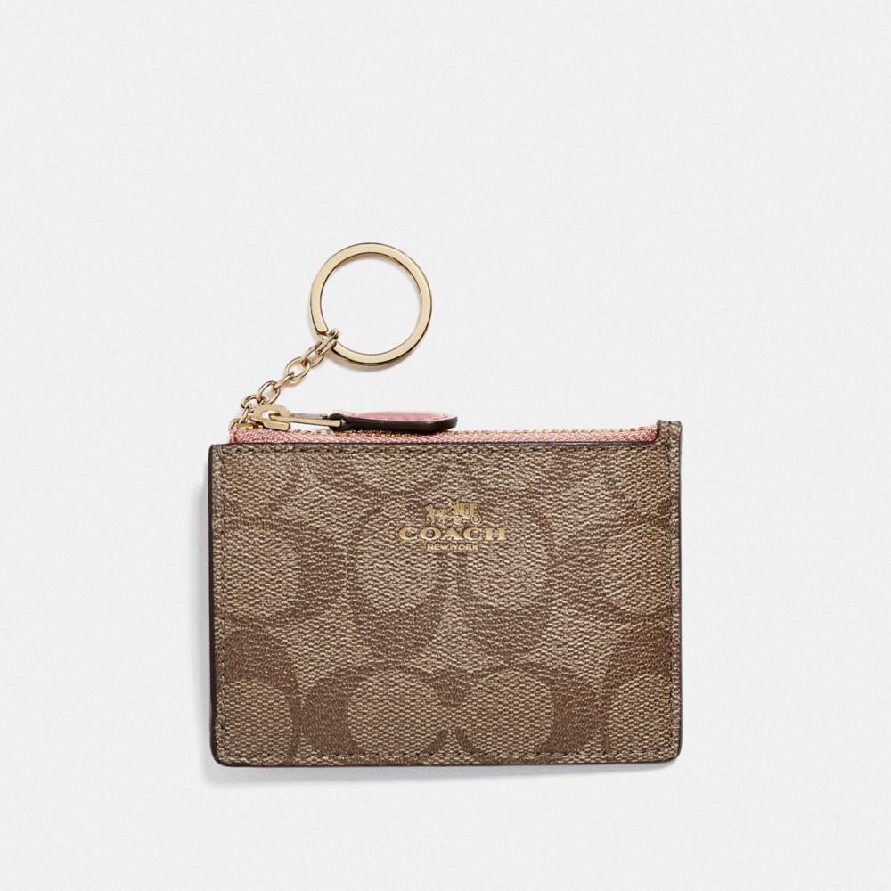 Signature coated canvas| Credit card slot and ID window| Zip-top closure, fabric lining| Attached split key ring| 4 1/4" (L) x 3" (H) x 1/2" (W)