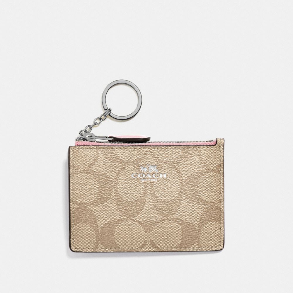 Signature coated canvas| Credit card slot and ID window| Zip-top closure, fabric lining| Attached split key ring| 4 1/4" (L) x 3" (H) x 1/2" (W)