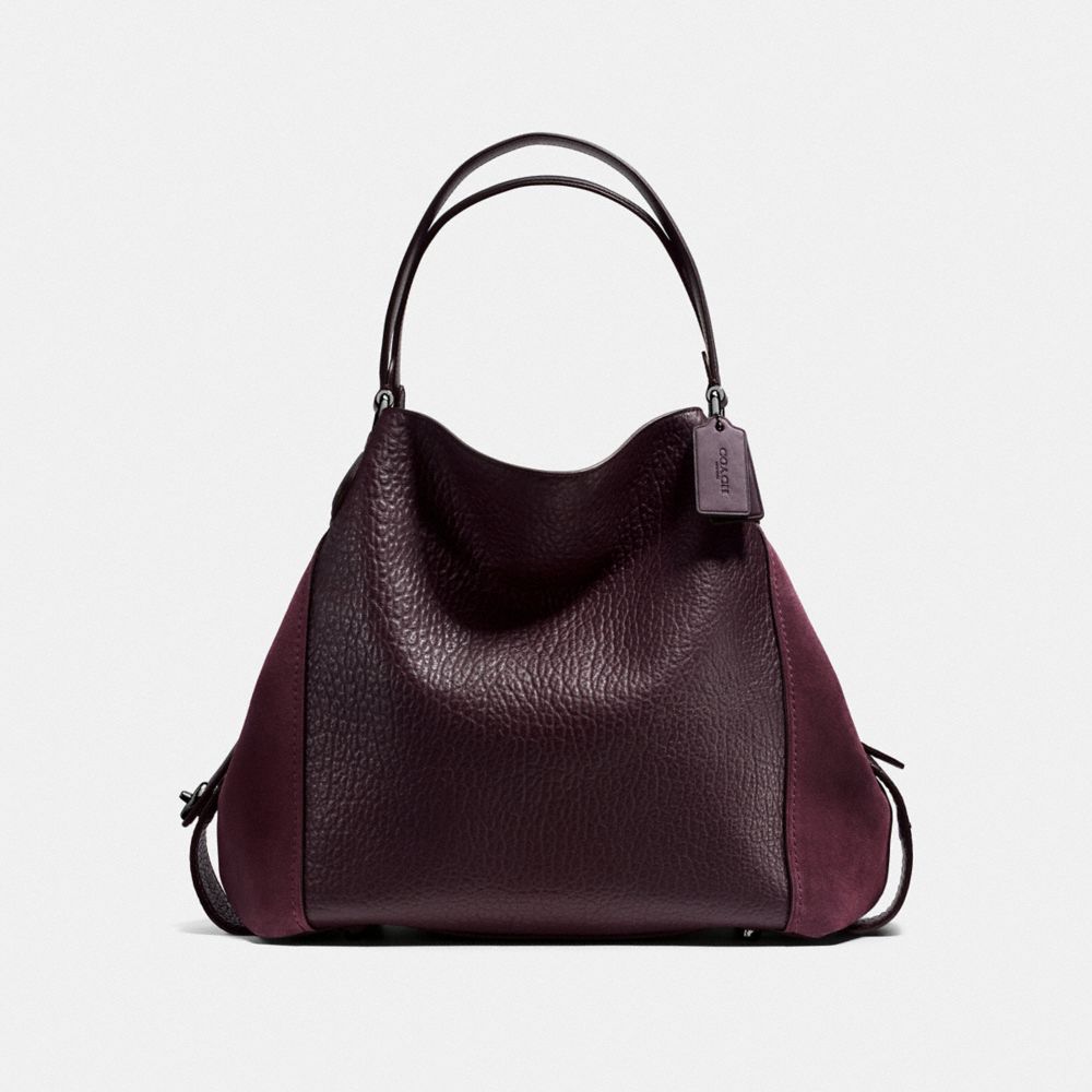 Buffalo-embossed leather, smooth leather and suede| Inside zip and snap pockets| Center zip compartment| Snap closure, fabric lining | Handles with 10 1/4" drop| 13 1/2" (L) x 12 1/4" (H) x 6 1/4" (W)