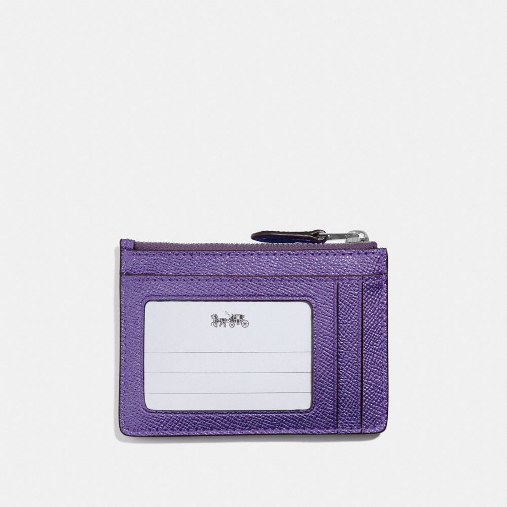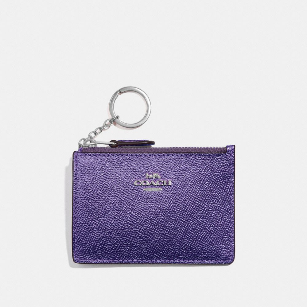 | Metallic crossgrain leather| Credit card slot and ID window| Zip-top closure, fabric lining| Attached split key ring| 4 1/4" (L) x 3" (H) x 1/2" (W)