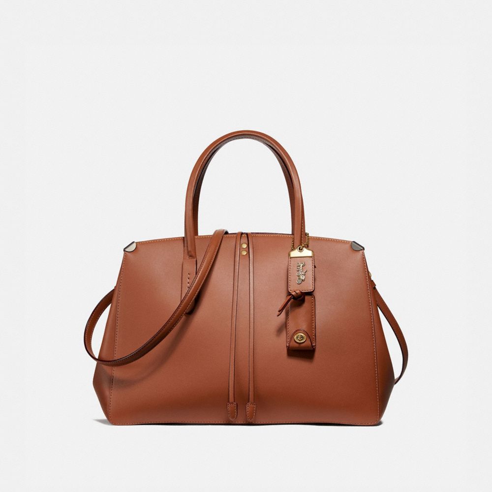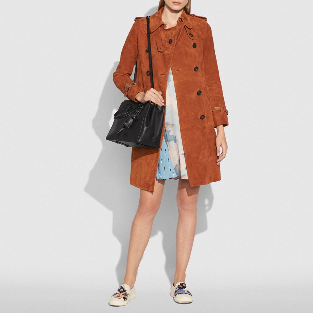Glovetanned leather| Inside open pocket| Center zip compartment| Tie closure, suede lining| Handles with 5" drop| Detachable strap with 17 3/4" drop for shoulder or crossbody wear| 13 1/4" (L) x 9 3/4" (H) x 5 3/4" (W)