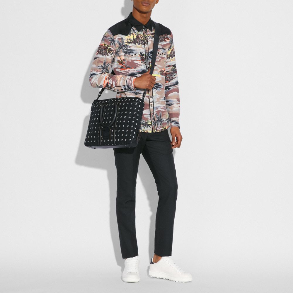Printed CORDURA® fabric with refined calf leather details| Inside zip, cell phone and multifunction pockets| Inside sleeve with secure tab for a 15" laptop| Zip-around two-way closure| Fabric lining| Two exterior slip pockets with magnetic snap closures| Handles with 4 1/4" drop | Detachable nylon strap with 25" drop for shoulder or crossbody wear| 15 3/4" (L) x 11 3/4" (H) x 2 1/4" (W)| CORDURA® is a trademark of INVISTA for durable fabric