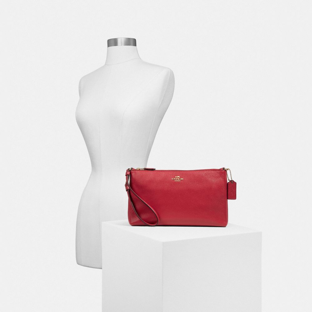 Refined pebble leather| Six credit card slots| Inside zip and open pocket| Zip-top closure, fabric lining| Strap with clip to form a wrist strap or attach to the inside of a bag| 9 3/4" (L) x 6" (H) x 1 1/4" (W)