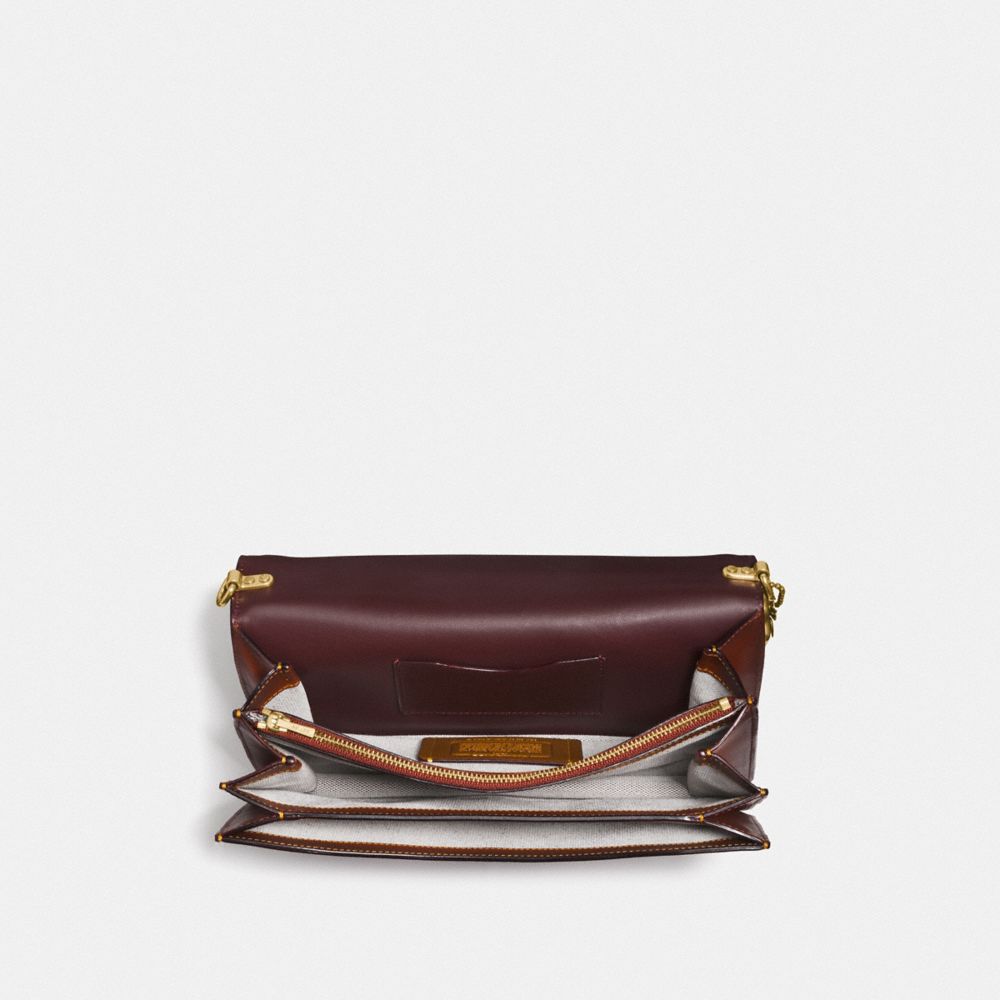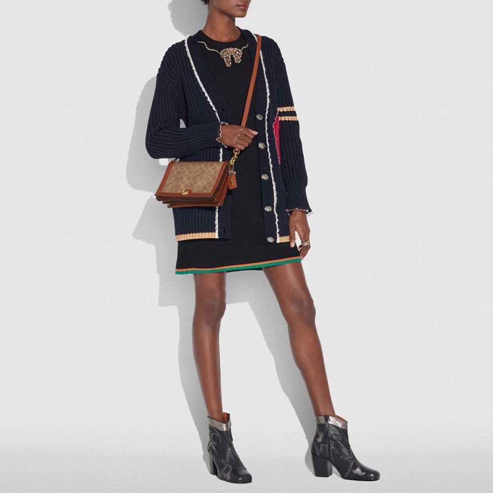 Signature coated canvas with refined calf leather details| Credit card slot| Inside zip and open pockets| Turnlock closure, fabric lining| Detachable strap with 22" drop for shoulder or crossbody wear| 9 3/4" (L) x 6" (H) x 1 3/4" (W)