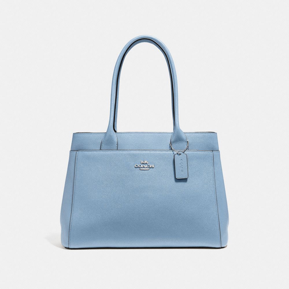 | Crossgrain leather| Inside cell phone and multifunction pockets| Center zip compartment| Snap closures, fabric lining| Handles with 7 3/4" drop| Outside magnetic snap pocket| 13 3/4" (L) x 9 3/4" (H) x 5 1/2" (W)