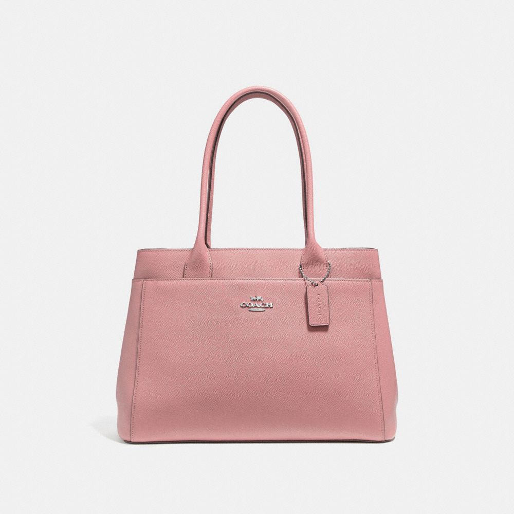 | Crossgrain leather| Inside cell phone and multifunction pockets| Center zip compartment| Snap closures, fabric lining| Handles with 7 3/4" drop| Outside magnetic snap pocket| 13 3/4" (L) x 9 3/4" (H) x 5 1/2" (W)