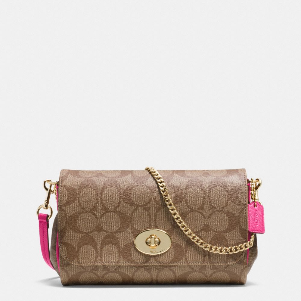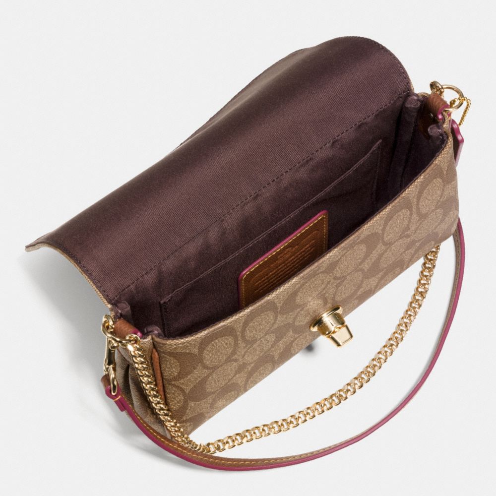 Details| | | Signature canvas with leather trim| Inside zip, cell phone and multifunction pocket| Turnlock closure, fabric lining| Adjustable strap with 20 1/2" drop for shoulder and crossbody wear| 9" (L) x 5" (H) x 1 1/2" (W)| Clutch, wristlet and crossbody in one convertible design