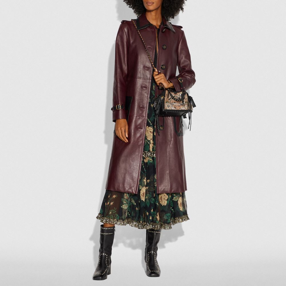 Signature coated canvas and refined calf leather| Inside zip and multifunction pockets| Zip closure, fabric lining| Side snap pockets| Handles with 4" drop| Detachable strap with 22" drop for shoulder or crossbody wear| 7 3/4" (L) x 5 1/2" (H) x 4" (W)