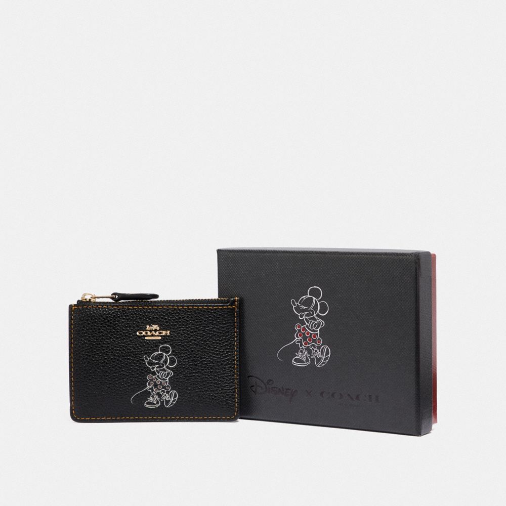 Refined pebble leather| Credit card slot and ID window| Zip-top closure, fabric lining| Attached split key ring| 4 1/4" (L) x 3" (H)| Packaged in a Coach gift box| Disney x Coach| ©Disney