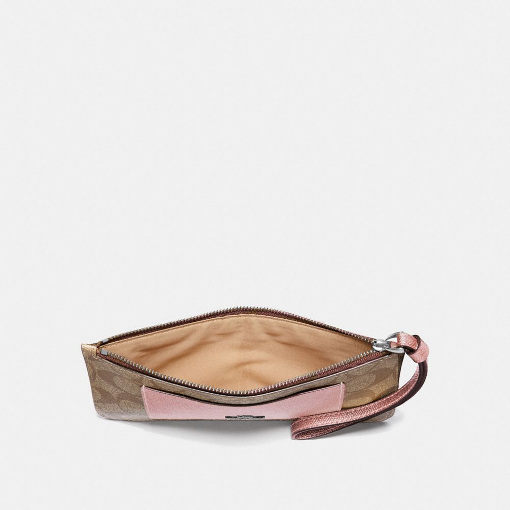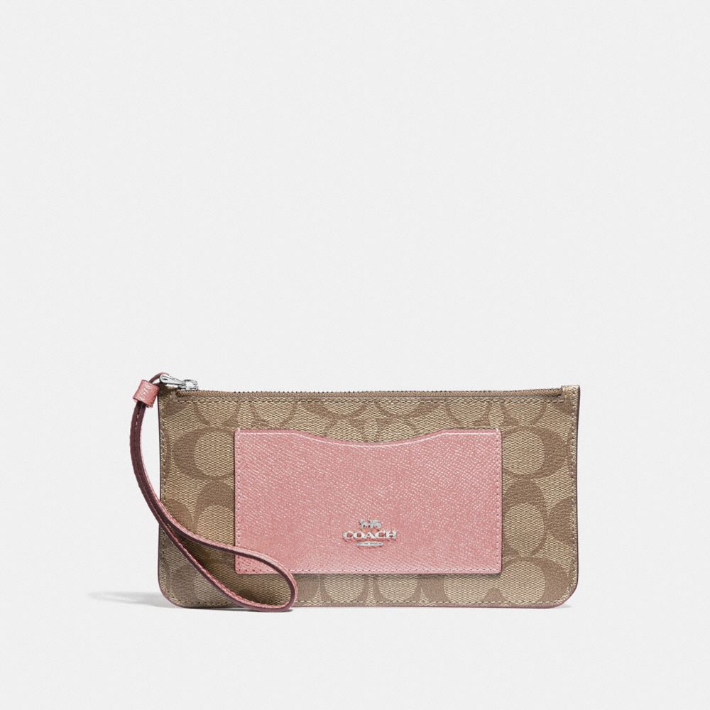 | Signature coated canvas with smooth leather details| Inside open compartment| Zip-top closure| Seven credit card slots| Full-length bill compartment| Attached wrist strap| 7 3/4" (L) x 4 1/4" (H) x 3/4" (W)