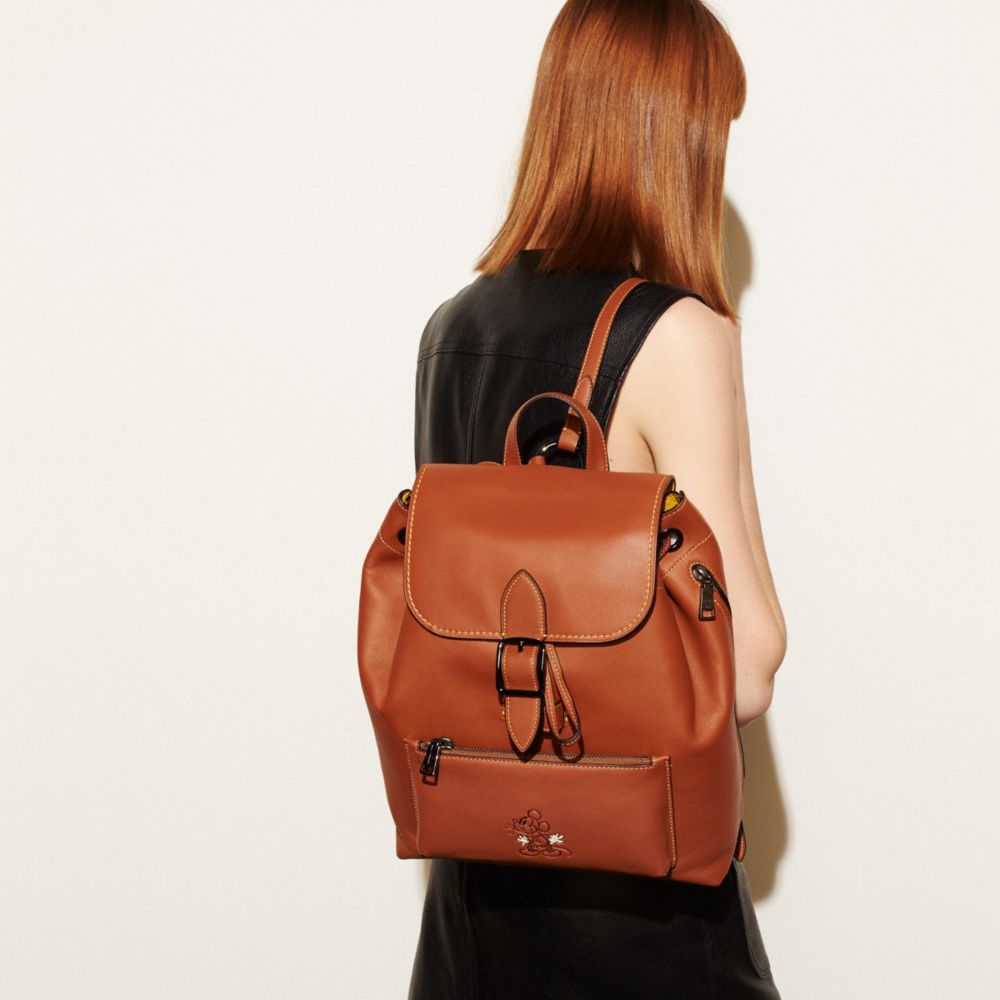 | Glovetanned leather| Inside zip and snap pockets| Inside tech sleeve with secure tab| Flap closure, leather lining| Top handle with 3 1/4" drop| Outside zip pocket| Outside zip access to interior| Adjustable shoulder straps| 13 3/4" (L) x 13 1/4" (H) x 6 1/4" (W)| Disney x Coach