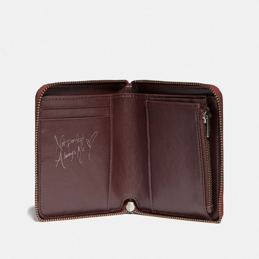 Refined calf leather| Two credit card slots| Bill compartment| Inside zip coin pocket| Zip-around closure| 4 1/2" (L) x 3 3/4" (H) x 3/4" (W)| Coach x Selena Gomez collection