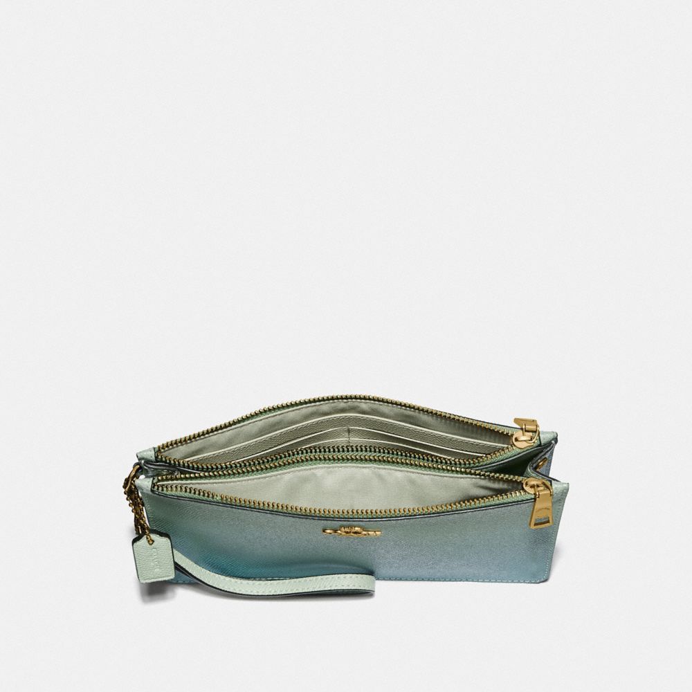 | Crossgrain leather| Six credit card slots| Inside open pocket| Double zip closure, fabric lining| Center snap compartment| Detachable wrist strap| 8 1/4" (L) x 5" (H) x 2" (W)| Fits all phone sizes up to an iPhone X and Samsung S7 Edge