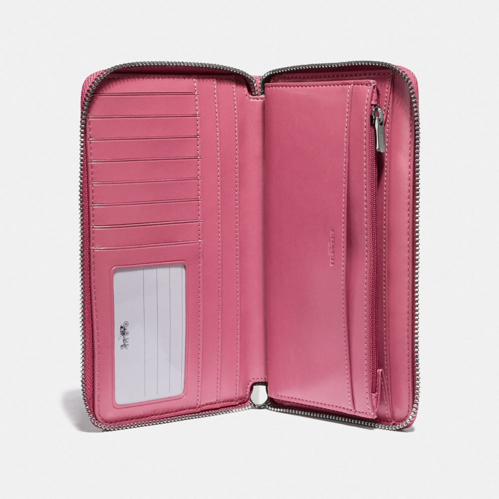 | Ostrich-embossed leather| Seven credit card slots| Full-length bill compartments| ID window| Inside open pockets| Zip coin pocket| Zip-around closure| 7 3/4" (L) x 4 1/2" (H) x 3/4" (H)