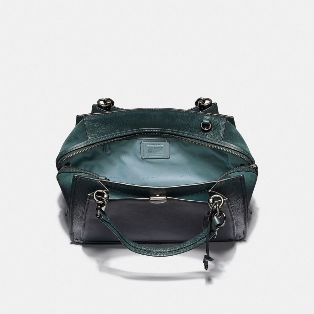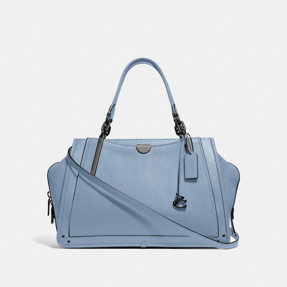 Polished pebble leather, smooth leather and suede| Inside zip and multifunction pockets| Zip closure, fabric lining| Side snap pockets| Handles with 6 3/4" drop| Detachable strap with 18" drop for shoulder or crossbody wear| 14 1/4" (L) x 9" (H) x 5 1/4" (W)