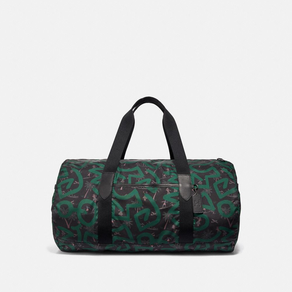 | Nylon with smooth leather details| Inside zip and multifunction pockets| Zip-top closure, fabric lining| Handles with 6" drop| Outside slip pocket| 19 3/4" (L) x 9 1/4" (H) x 11 1/4" (W)| Duffle folds into included zip pouch| Coach x Keith Haring collection| © Keith Haring Foundation. Licensed by Artestar, New York.