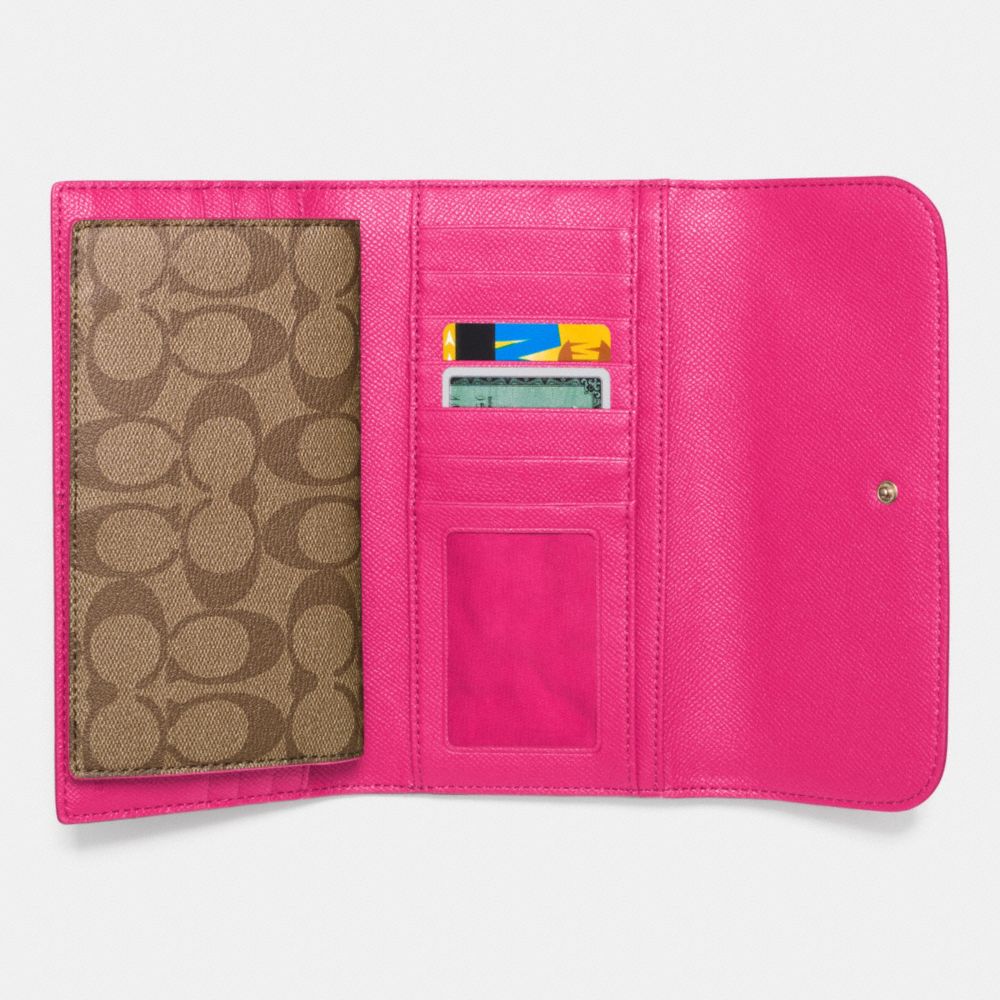 Details| | | Signature coated canvas with leather trim| Credit card and multifunction pockets| Full-length bill compartments| Removable checkbook holder with pen loop| ID Window| Zip coin pocket| Snao closure| 7 3/4" (L) x 4 1/4" (H)