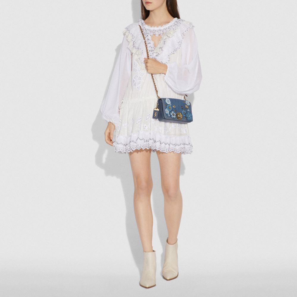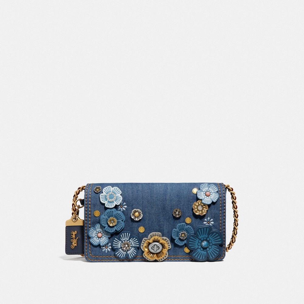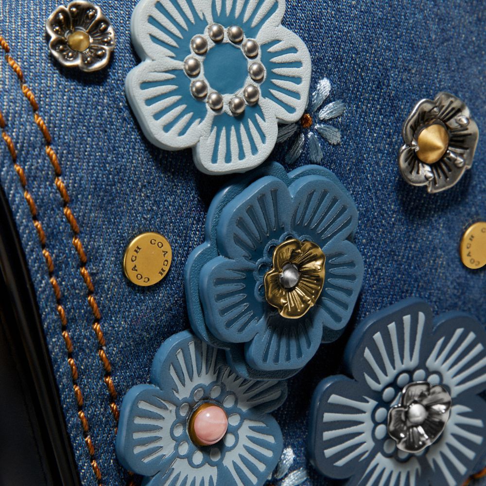Denim and glovetanned leather| Inside open and coin purse pockets| Turnlock closure, leather lining| Outside slip pocket| Detachable strap with 22" drop doubles up for three ways to wear: short or long on the shoulder or crossbody style| 9" (L) x 5" (H) x 2" (W)