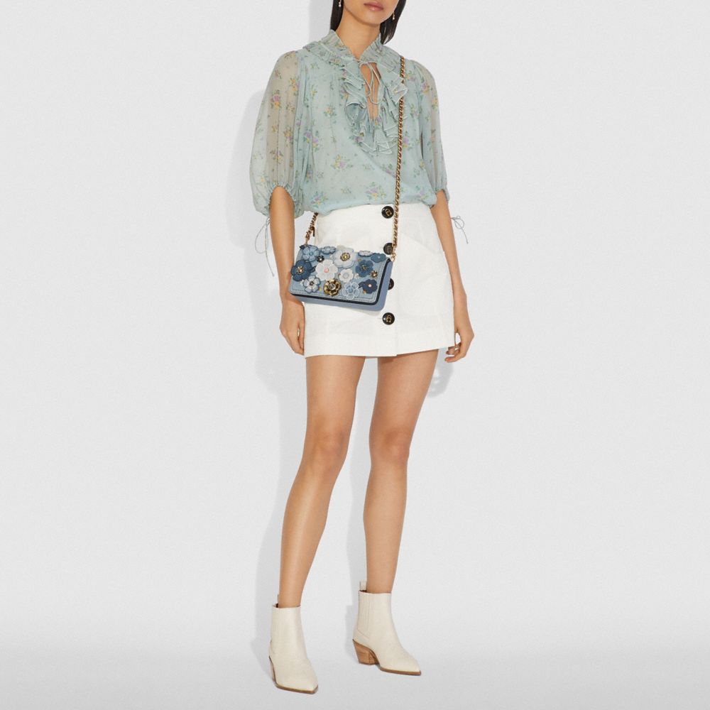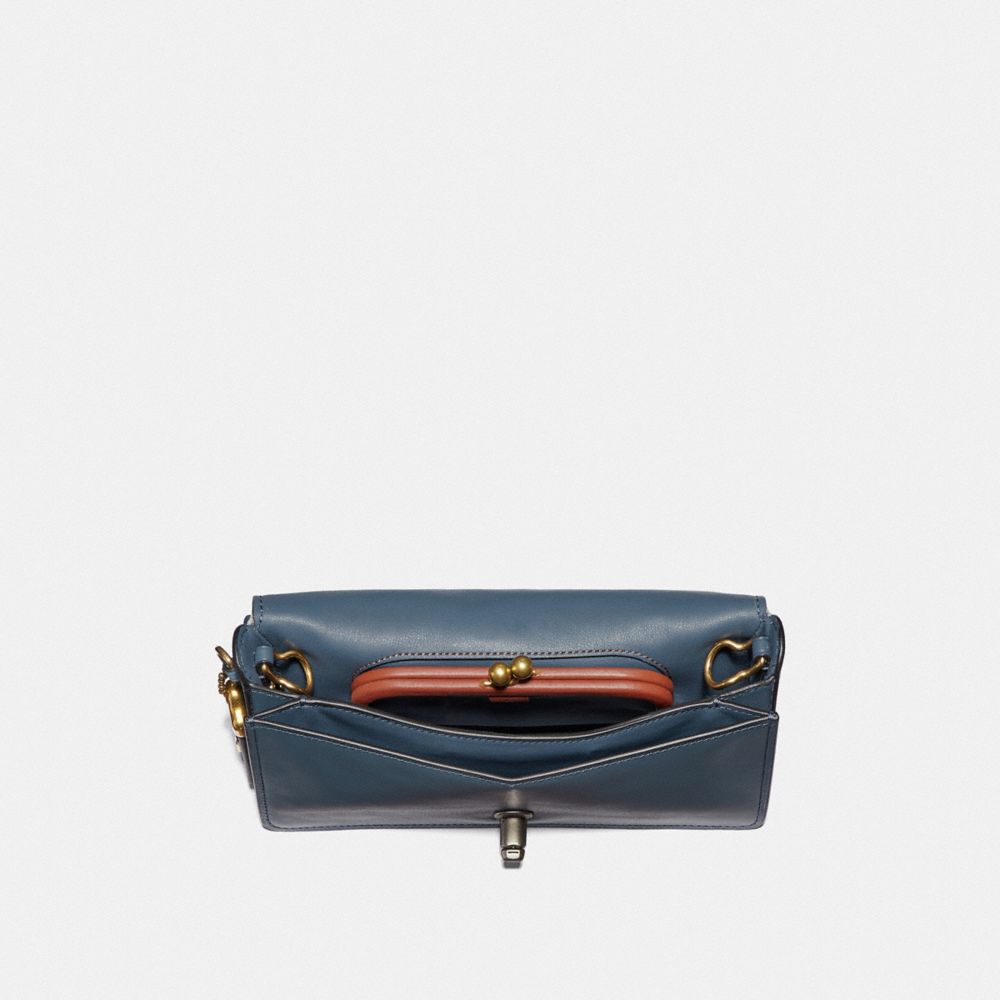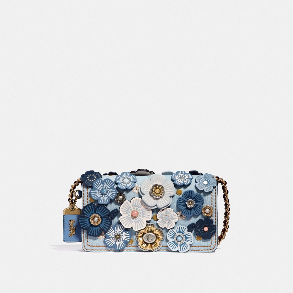 Denim and glovetanned leather| Inside open and coin purse pockets| Turnlock closure, leather lining| Outside slip pocket| Detachable strap with 22" drop doubles up for three ways to wear: short or long on the shoulder or crossbody style| 9" (L) x 5" (H) x 2" (W)