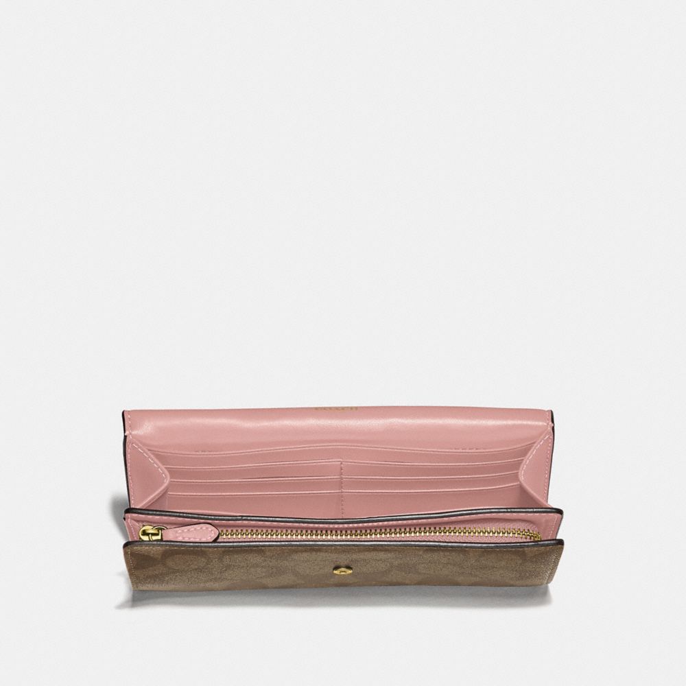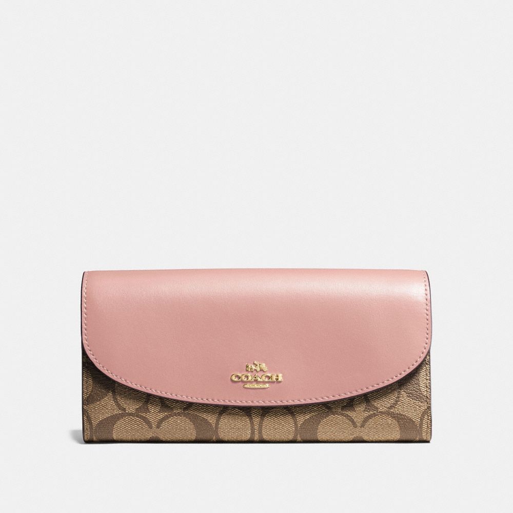 | Signature coated canvas with crossgrain leather details| 12 credit card slots| Full-length bill compartment| Zip coin pocket| Snap closure | Outside open pocket| 7 3/4" (L) x 4" (H) x 3/4" (W)