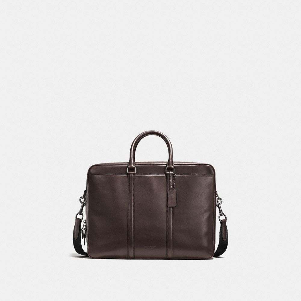 | Sport calf leather| Two zippered compartments with multiple interior pockets| Zip-top closure, fully lined interior| Handles with 4 3/4" drop| Outside slip pocket| Detachable nylon strap with 51 1/4" drop for shoulder or crossbody wear| Fits a 15" laptop| 15 3/4" (L) x 11 3/4" (H) x 4 1/4" (W)