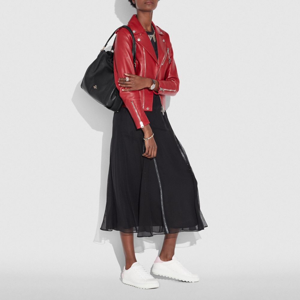 Polished pebble leather| Inside zip and multifunction pockets| Center zip compartment| Snap closure, fabric lining| Handles with 7" drop | 12 1/2" (L) x 10 1/4" (H) x 4 1/4" (W)