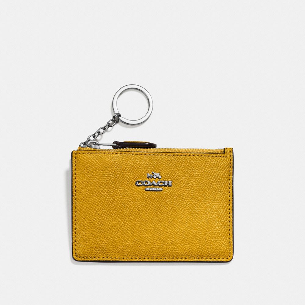 Crossgrain leather| Credit card slot and ID window| Zip-top closure, fabric lining| Attached split key ring| 4 1/4" (L) x 3" (H) x 1/2" (W)