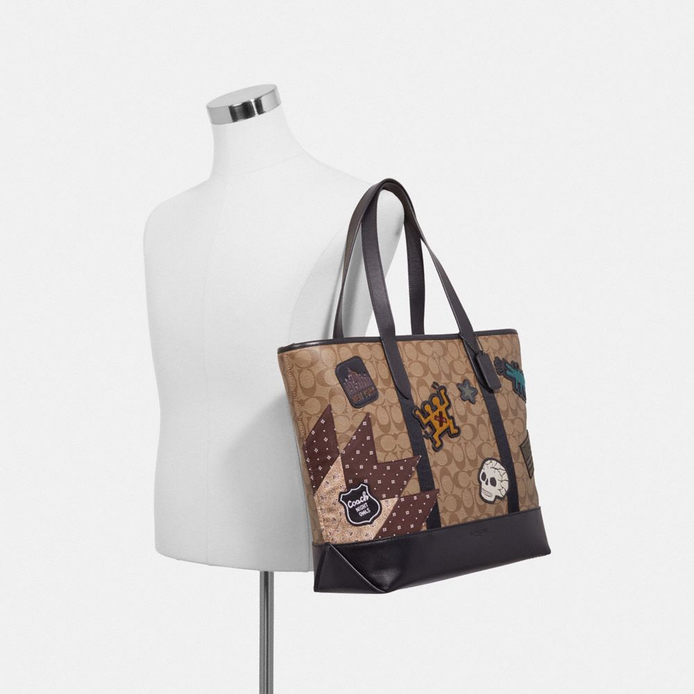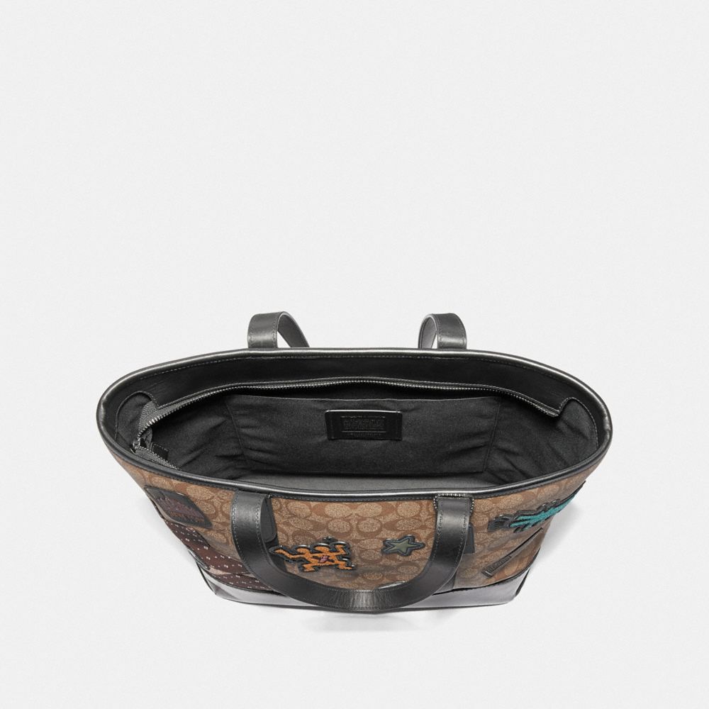 | Signature coated canvas and refined calf leather| Inside zip, cell phone and multifunction pockets| Zip-top closure, fabric lining| Handles with 9 1/2" drop| Outside slip pocket| 13 1/4" (L) x 15" (H) x 5 1/2" (W)| Coach x Keith Haring collection| © Keith Haring Foundation. Licensed by Artestar, New York.