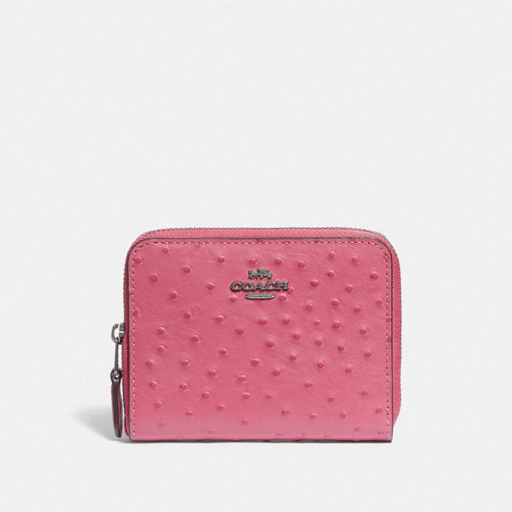 | Ostrich-embossed leather| Two credit card slots| Bill compartment| Zip coin pocket| Zip-around closure| Outside slip pocket| 4 1/2" (L) x 3 3/4" (H) x 3/4" (W)