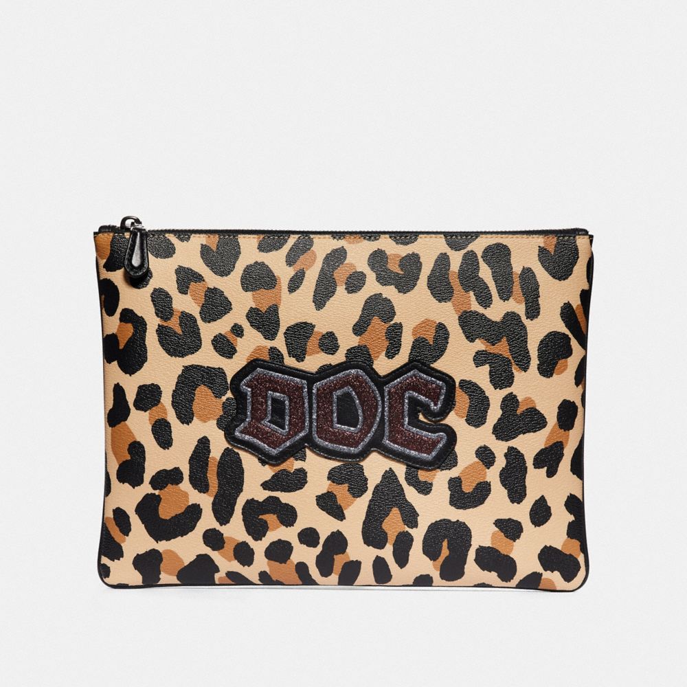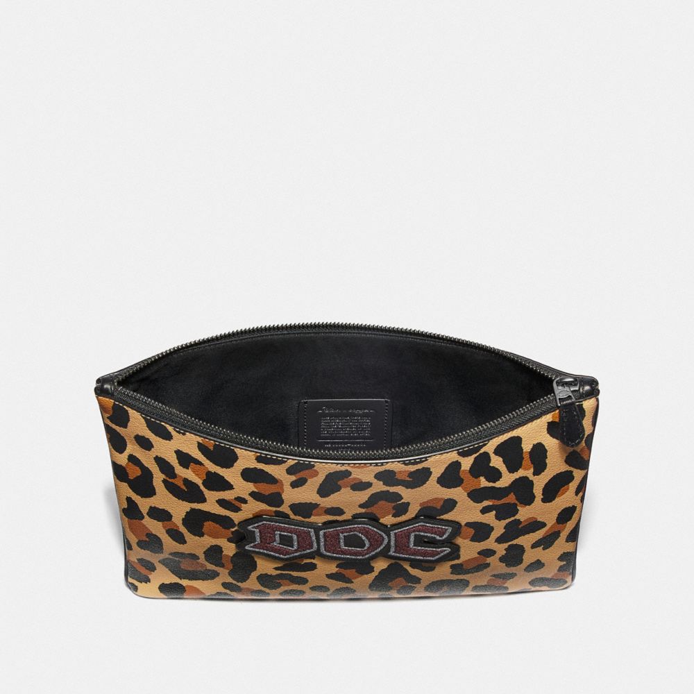 Printed coated canvas with smooth leather details| Zip-top closure, fabric lining| Detachable wrist strap| 11 3/4" (L) x 8 3/4" (H) x 3/4" (W)| Disney x Coach | ©Disney