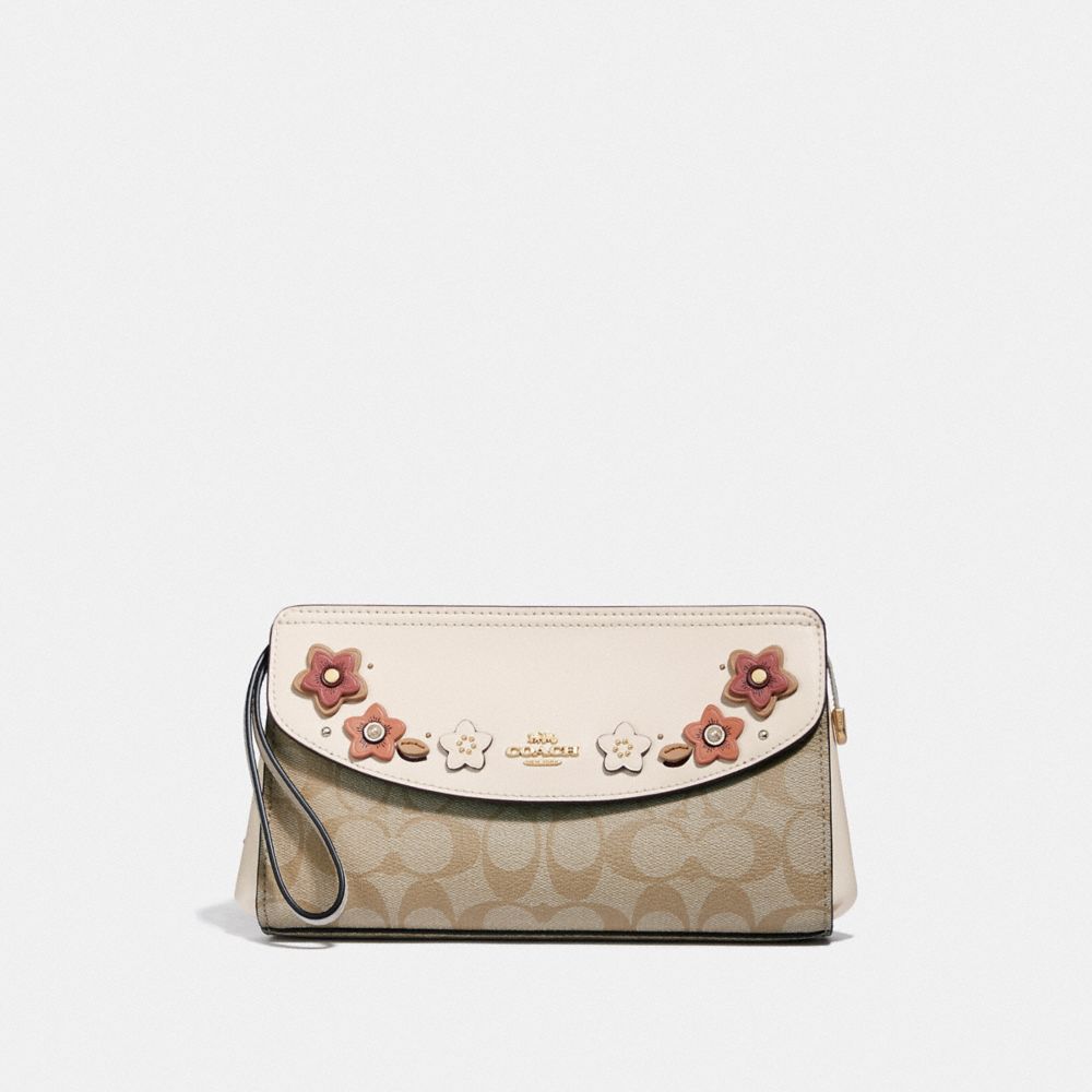 Signature coated canvas and smooth leather| Inside multifunction pocket| Zip closure, fabric lining| Wrist strap attached| Front flap pocket| 9" (L) x 5 1/4" (H) x 2 1/4" (W)