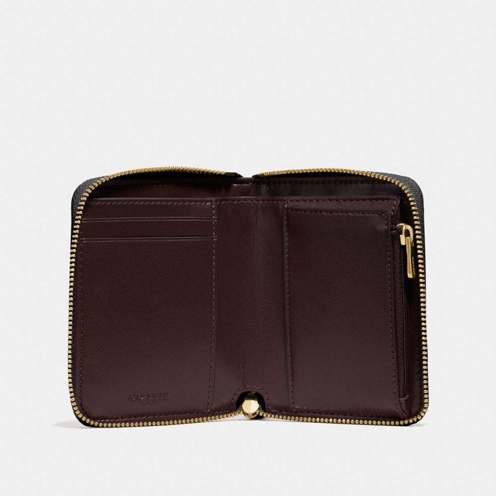 Printed coated canvas| Two credit card slots| Bill compartment| Zip coin pocket| Zip-around closure| Outside slip pocket| 4 1/2" (L) x 3 3/4" (H) x 3/4" (W)