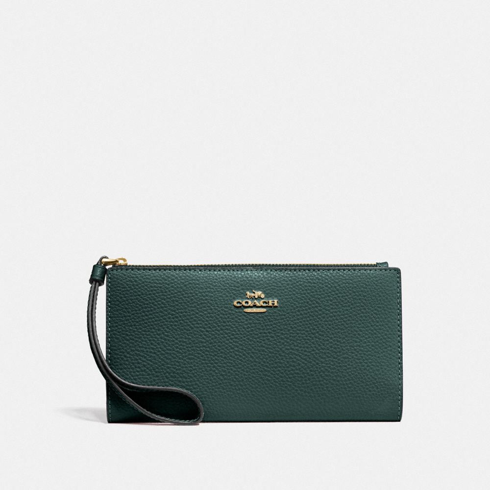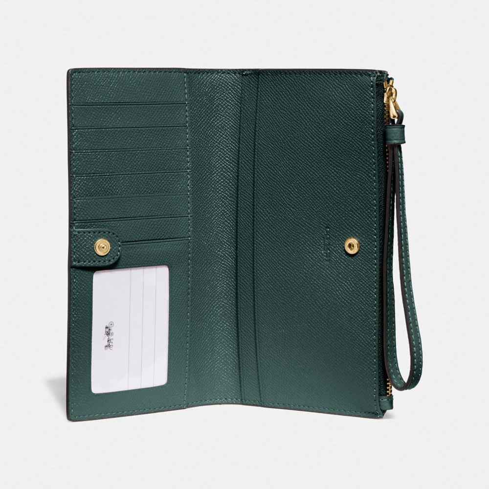 Polished pebble leather| Six credit card slots| ID window| Full-length bill compartments| Zip coin pocket| Snap closure| Wrist strap attached| 7 1/2" (L) x 4" (H) x 3/4" (W)