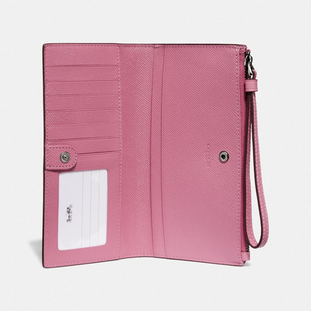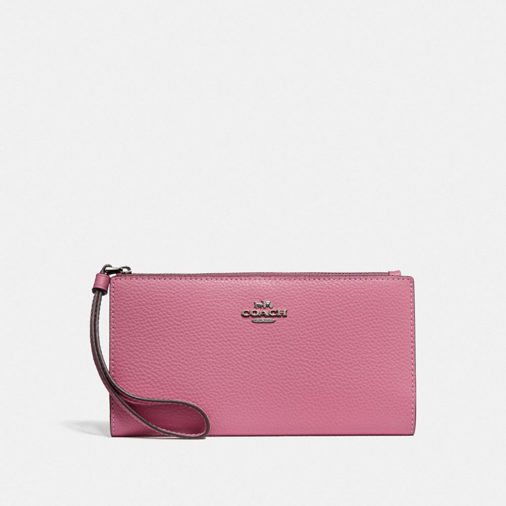 Polished pebble leather| Six credit card slots| ID window| Full-length bill compartments| Zip coin pocket| Snap closure| Wrist strap attached| 7 1/2" (L) x 4" (H) x 3/4" (W)