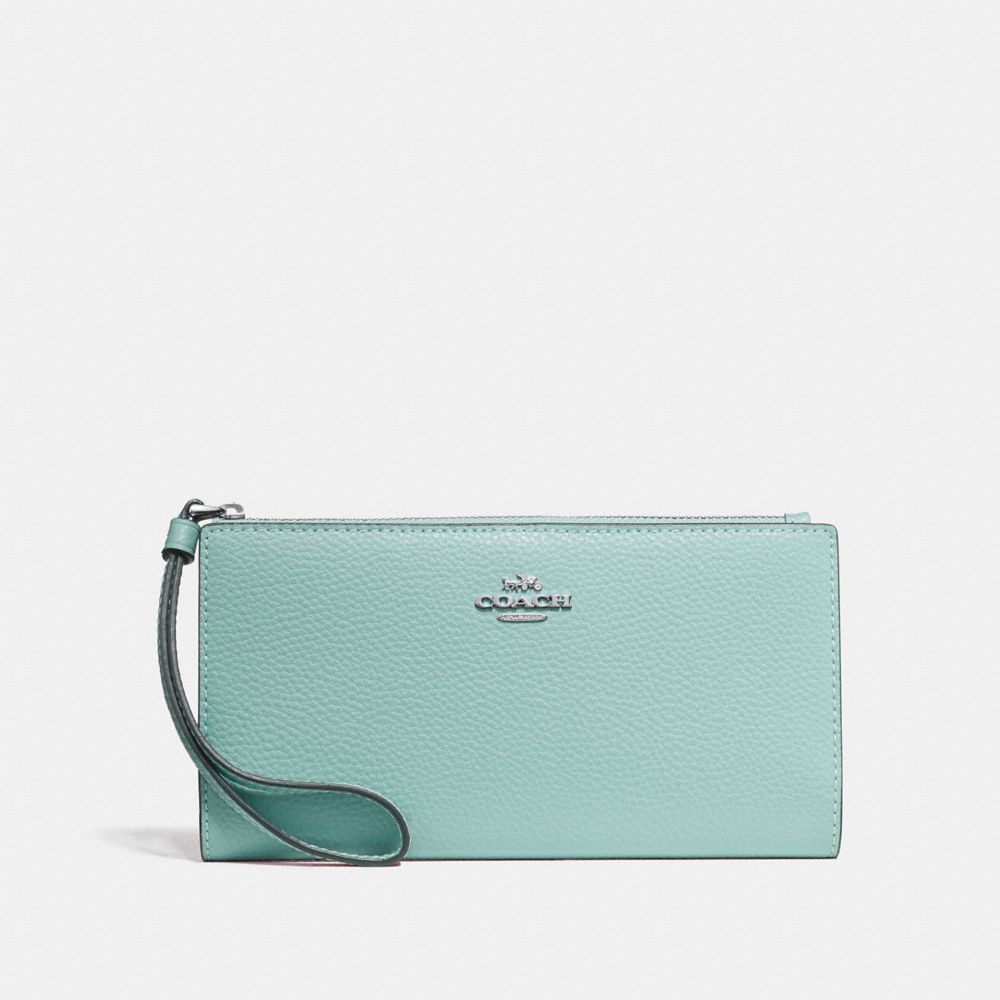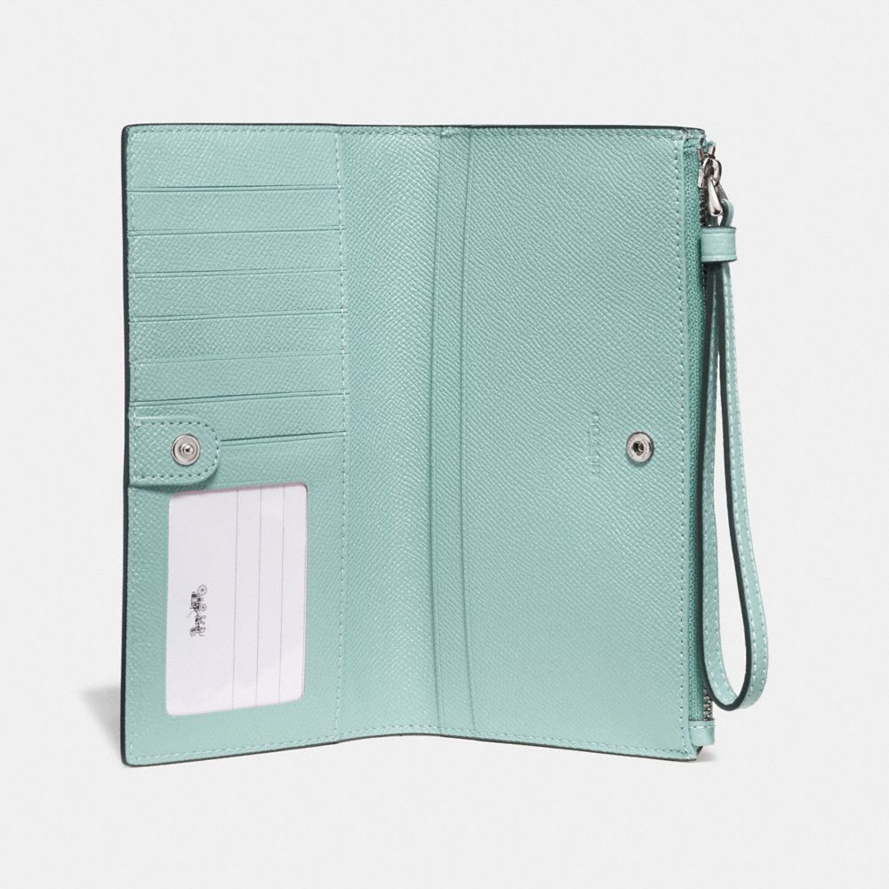 Polished pebble leather| Six credit card slots| ID window| Full-length bill compartments| Zip coin pocket| Snap closure| Wrist strap attached| 7 1/2" (L) x 4" (H) x 3/4" (W)