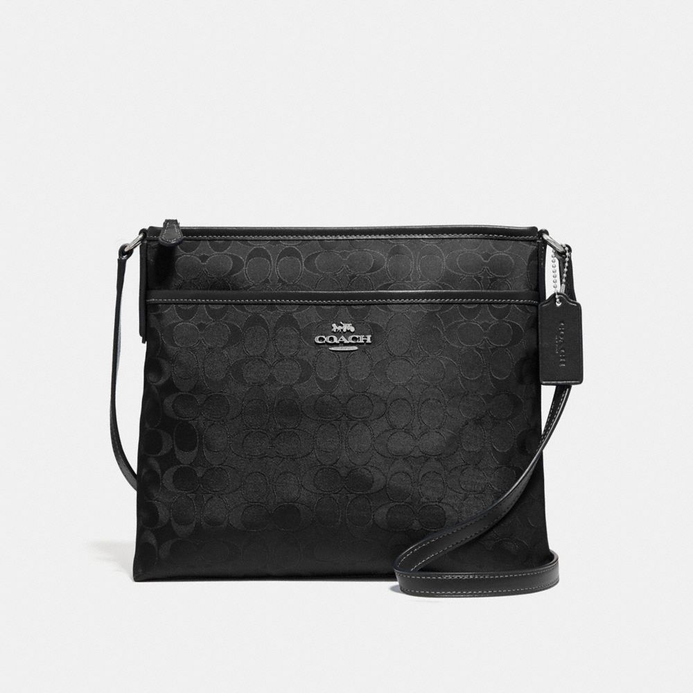 Signature nylon with smooth leather details| Zip-top closure, fabric lining| Outside slip pocket| Adjustable strap with 21 3/4" drop for shoulder or crossbody wear| 10 1/4" (L) x 8 3/4" (H) x 2" (W)
